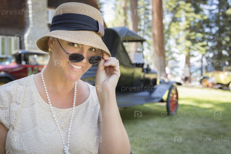 1920-х одетая девушка с зонтиком возле старинных автомобилей портрет