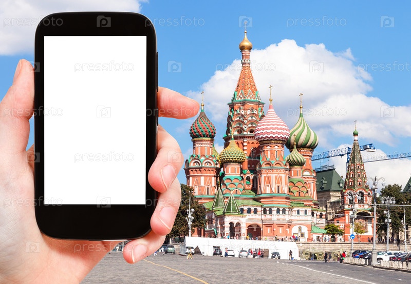 Телефон с вырезанным экрана и собора Святого Василия