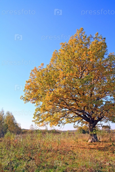 Дуб с пожелтевшей листвой в поле