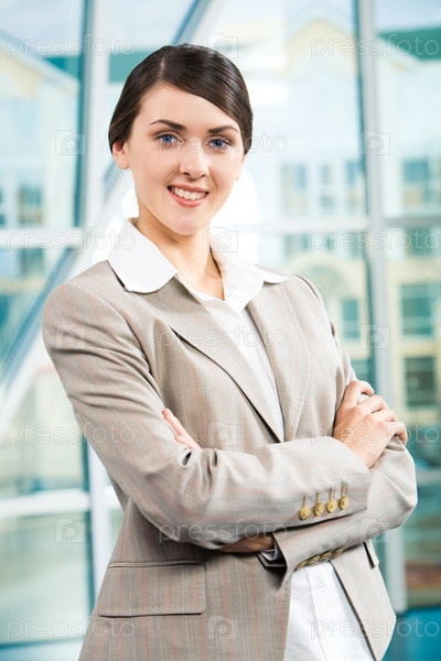 Портрет привлекательной улыбающейся деловой женщины в костюме на фоне современного окна