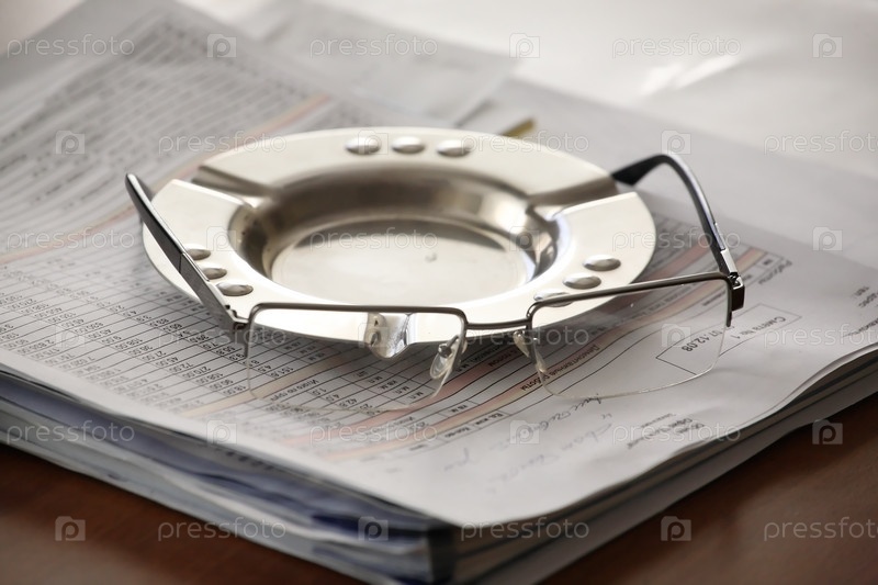 Пепельница и очки на стопке с документами