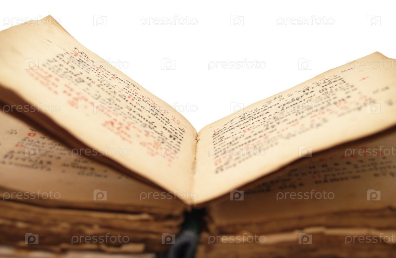 Старая раскрытая книга на белом фоне