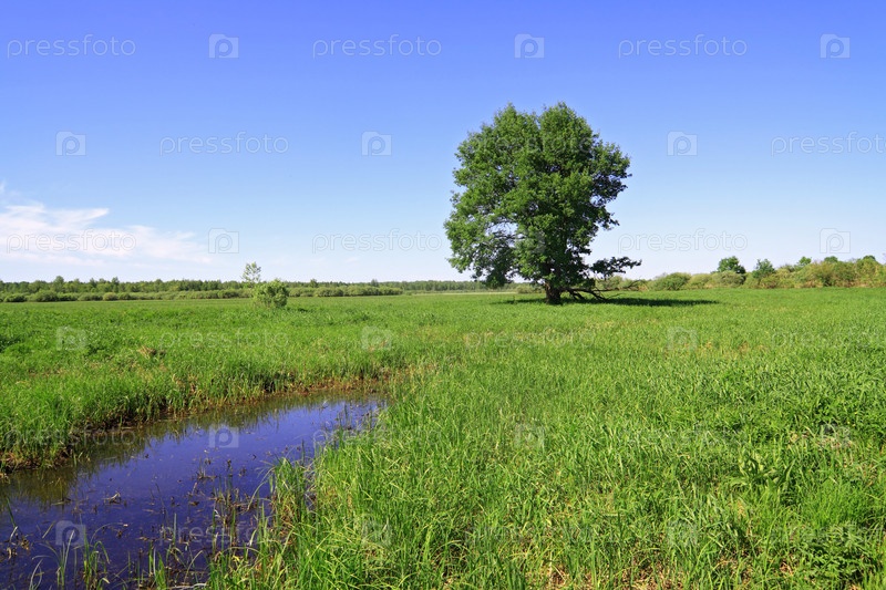 Большой дуб на поляне с прудом