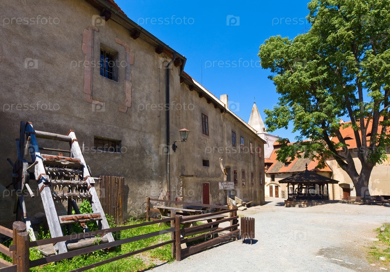 Колодец и орудия пыток во дворе средневекового замка Кривоклат, Чехия