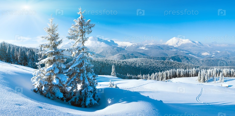 Две ели на заснеженном склоне, Карпаты, Украина