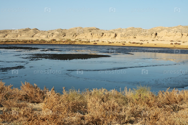 Горный пустынный пейзаж с ямой заполненной маслом и илом, с сухой травой на переднем плане