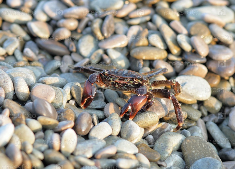 Бородавчатый краб или желтый краб, на морской гальке. Обнаружен в Черном море