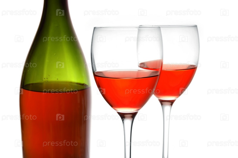 Бутылка красного вина и бокалы на белом фоне