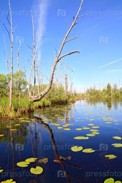 Засохшее дерево и кувшинки на озере
