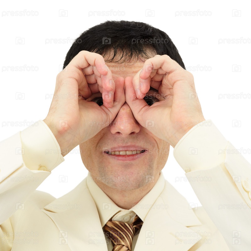 Бизнесмен смотрит сквозь пальцы, как бинокль