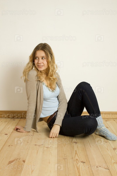 Молодая женщина сидит на деревянном полу