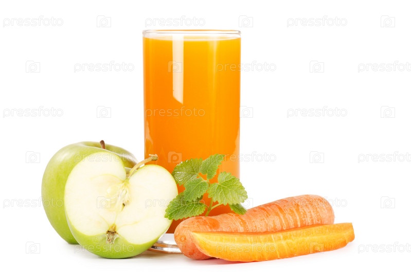 Стакан с морковным соком, морковь и яблоки, изолировано на белом