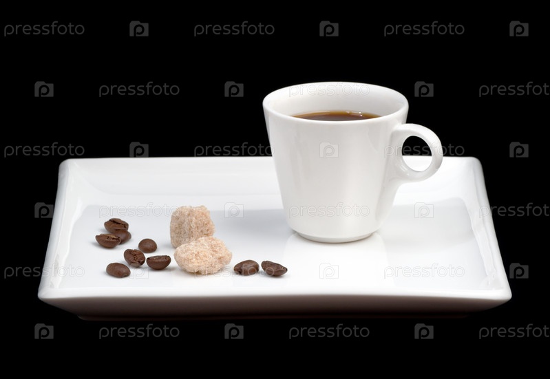 Чашка кофе на белом подносе на черном фоне