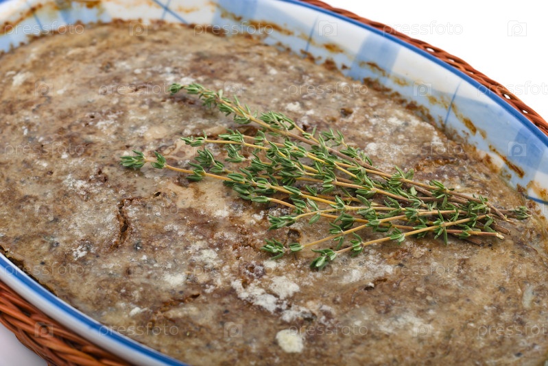 Паштет в керамическом блюде на белом фоне