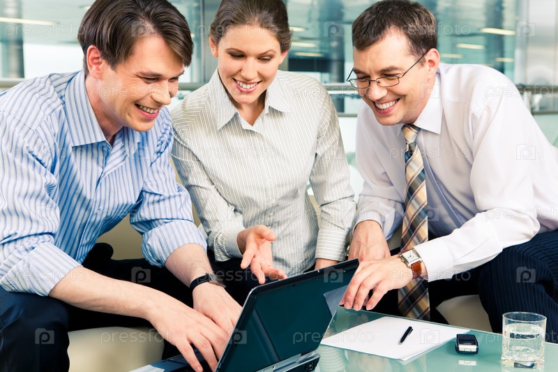 Портрет уверенных деловых людей, сидящих за столом и смотрящих на монитор ноутбука в офисном здании