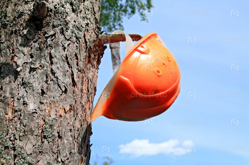 Оранжевая каска, висящая на дереве
