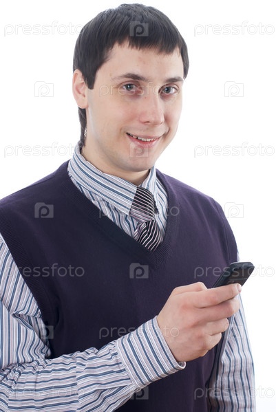 Молодой мужчина пишет сообщение на мобильном телефоне
