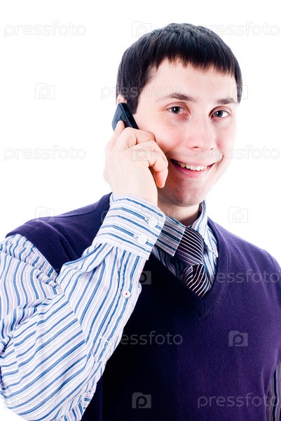Бизнесмен говорит по мобильному телефону на белом фоне
