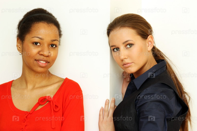 Две девушки позируют у стены
