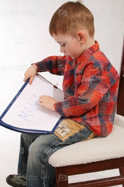 Мальчик пишет "мама" на бумаге