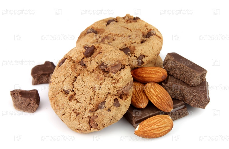 Овсяное печенье, миндаль и шоколад на белом фоне