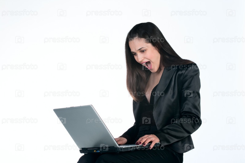 Молодая красивая бизнес-женщина, работающая на ноутбуке очень эмоциональна - изолирована на белом фоне