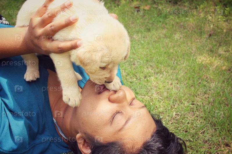 Женщина играет со Щенком