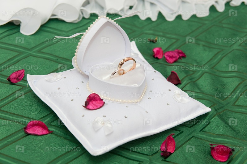 Обручальные кольца на подушечке крупным планом