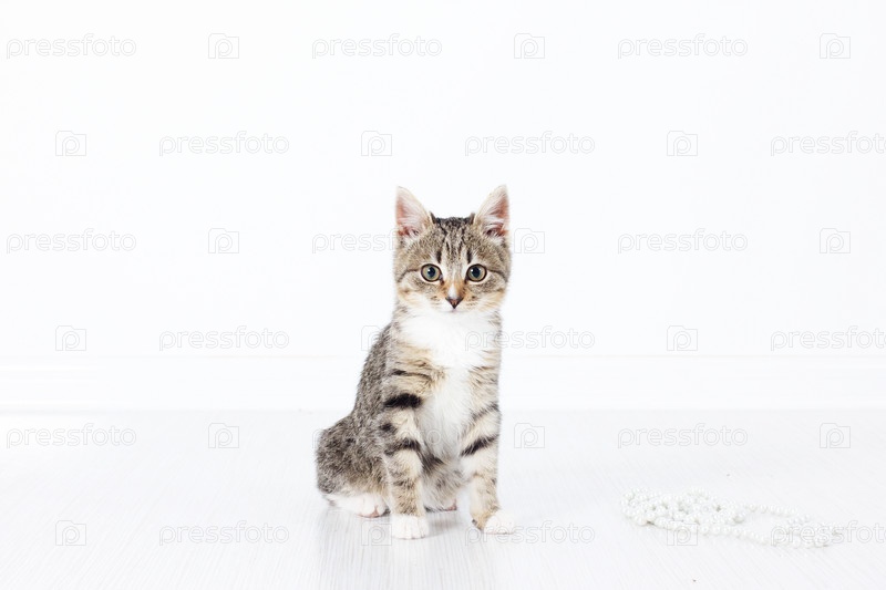 Полосатый кот сидит на белом фоне