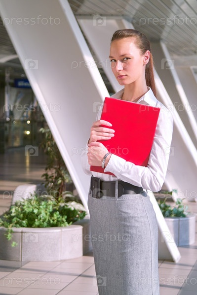 Портрет красивой молодой бизнес-леди с красной папкой