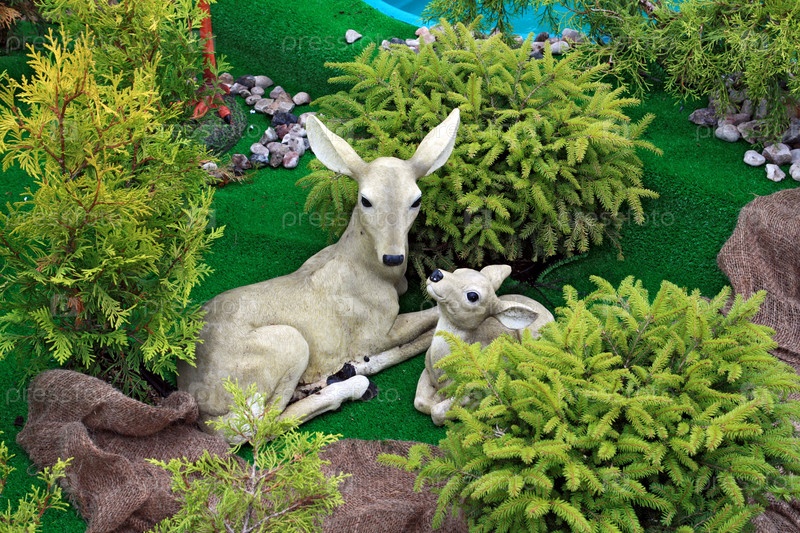 Игрушечные олени на фоне искусственного леса
