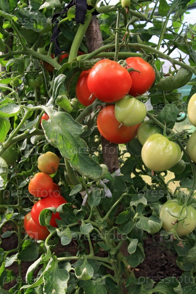 Красные и зеленые помидоры в теплице