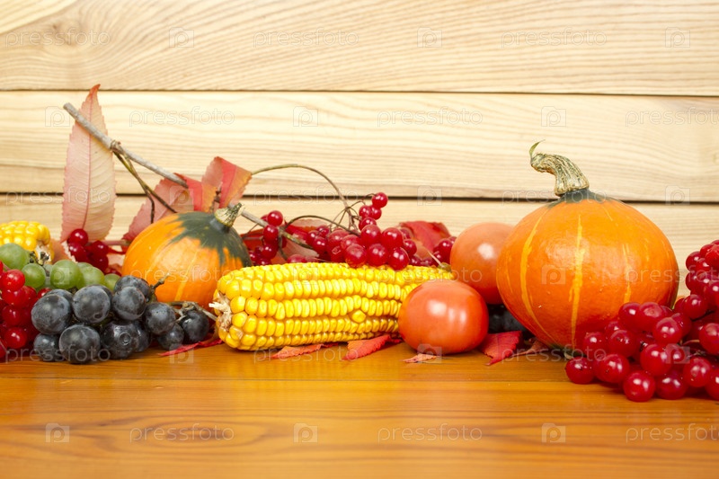 Дары осени тыква, кукуруза, осенние листья, помидоры, красные ягоды клюквы и винограда