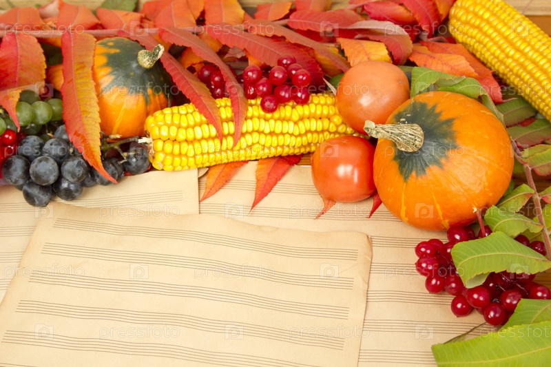 Дары осени тыква, кукуруза, осенние листья, помидоры, красные ягоды клюквы и винограда на старых печатных листах музыки