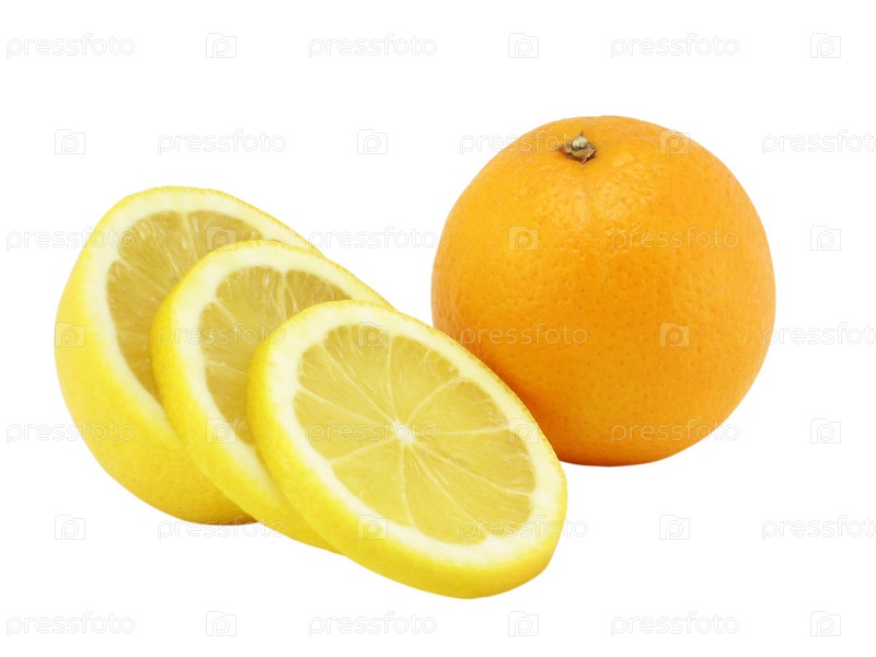 Нарезанный лимон и целый апельсин крупным планом на белом фоне; The cut lemon and the whole orange close up on a white background
