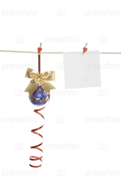 Белый лист и новогодние шарики висят на веревке. Изолированные на белом фоне