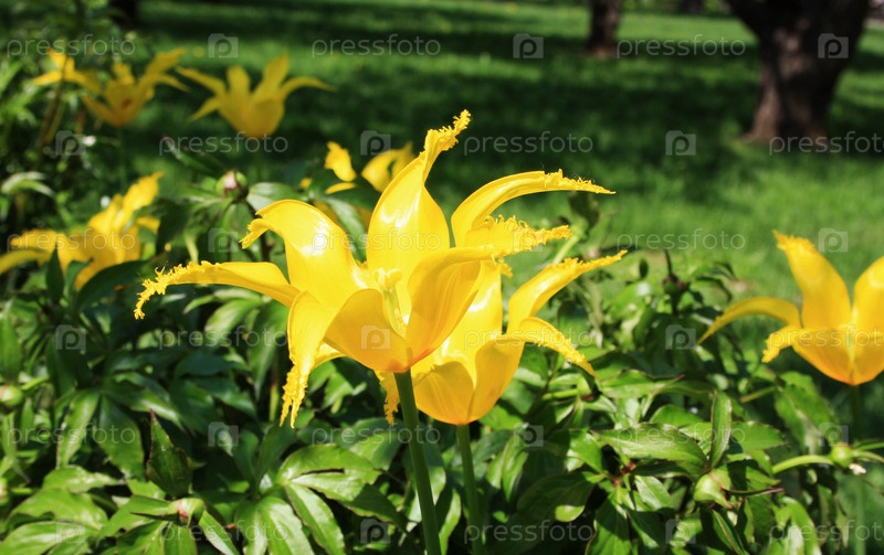 Ярко-желтые раскрытые бутоны на зеленой листве