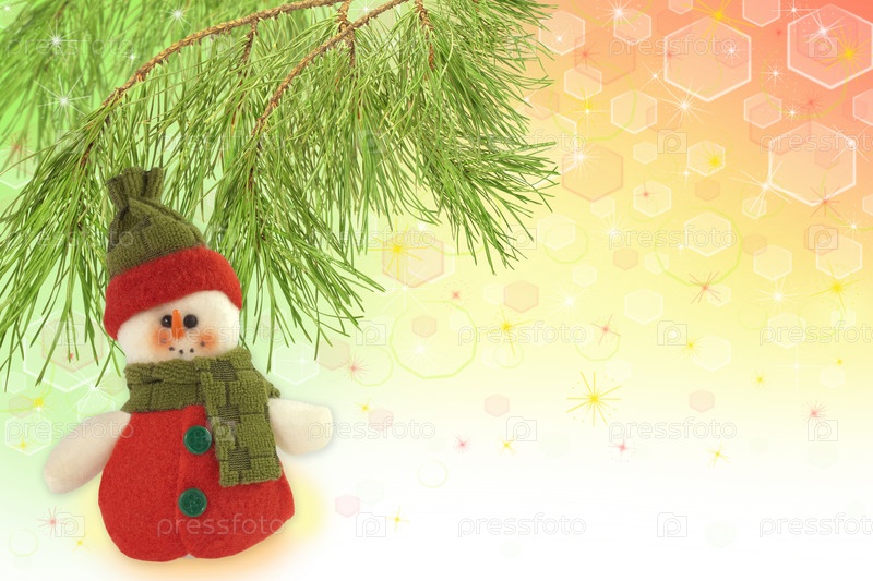Снеговик под сосновой веткой на абстрактном фоне