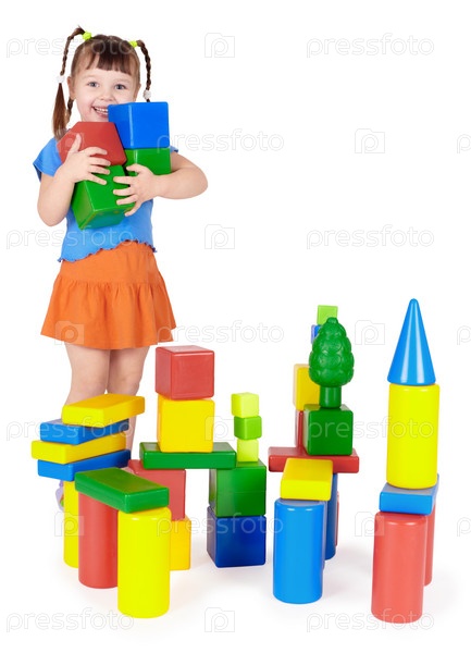 Счастливый ребенок строит замок из цветных блоков