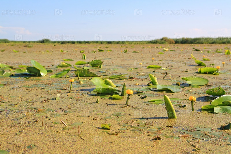 Кубышки среди ряски на поверхности озера