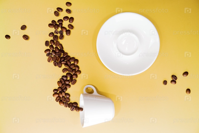 Белая чашка, тарелка и кофейные бобы на золотом фоне