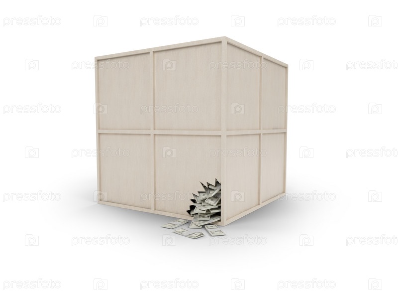 Вид деревянной коробки с деньгами на белом фоне