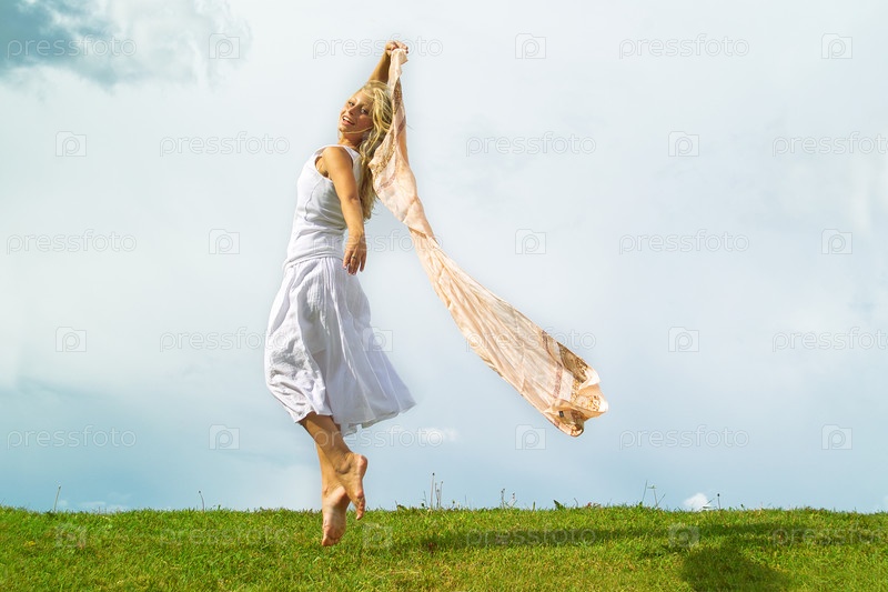 Молодая леди прыгает на фоне неба