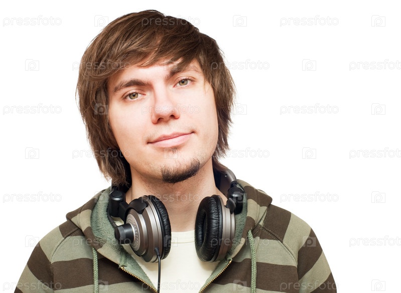 Молодые мужчины с наушниками на белом фоне