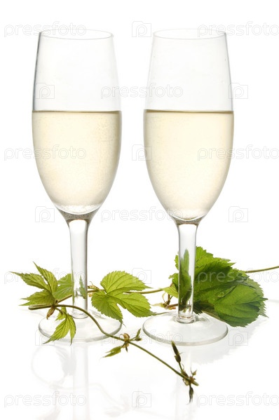 Два бокала с шампанским,украшенные листьями винограда на белом фоне