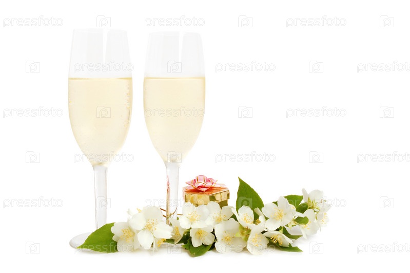 Два бокала с шампанским и подарок,украшенные цветами жасмина на белом фоне