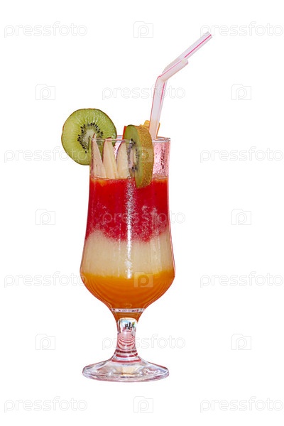 Трехслойный коктейль в стакане с кусками фруктов на белом фоне
