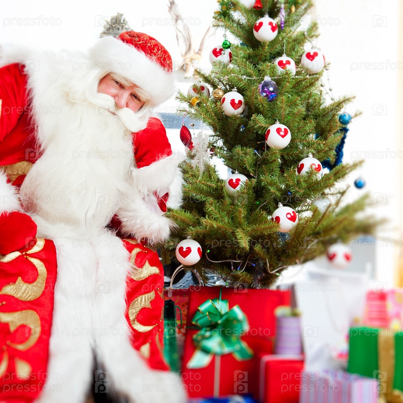 Дед Мороз в красном кафтане возле елки с подарками