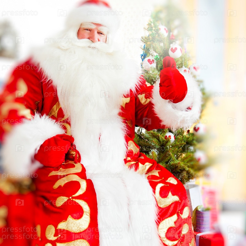 Дед Мороз в красном кафтане возле елки