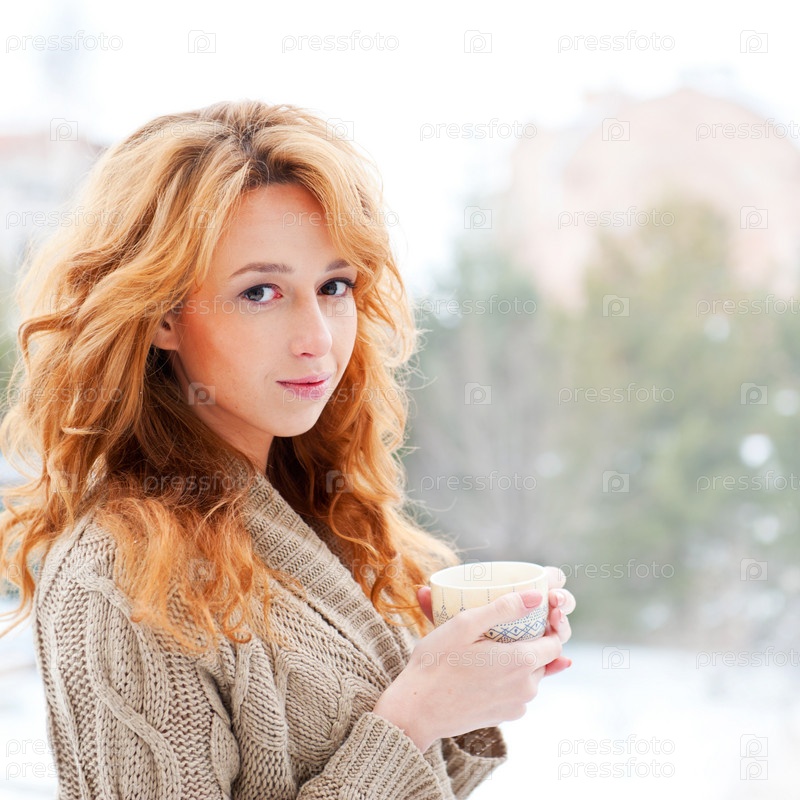 Девушка с рыжими волосами пьет кофе